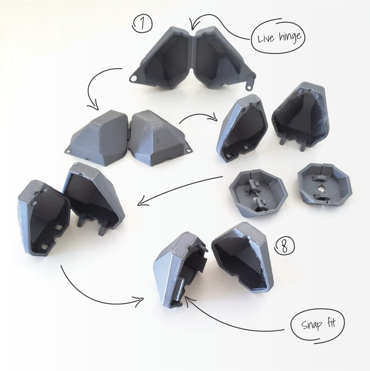 Over 8 different prototypes were made to test the product, each one had a different closing method. The best was the snap fit closing system.