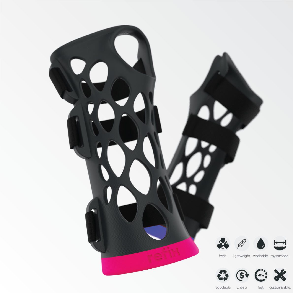 3d printed in rigid PLA thermoplastic and held with 3 neoprene straps to ensure a better immobilization.
